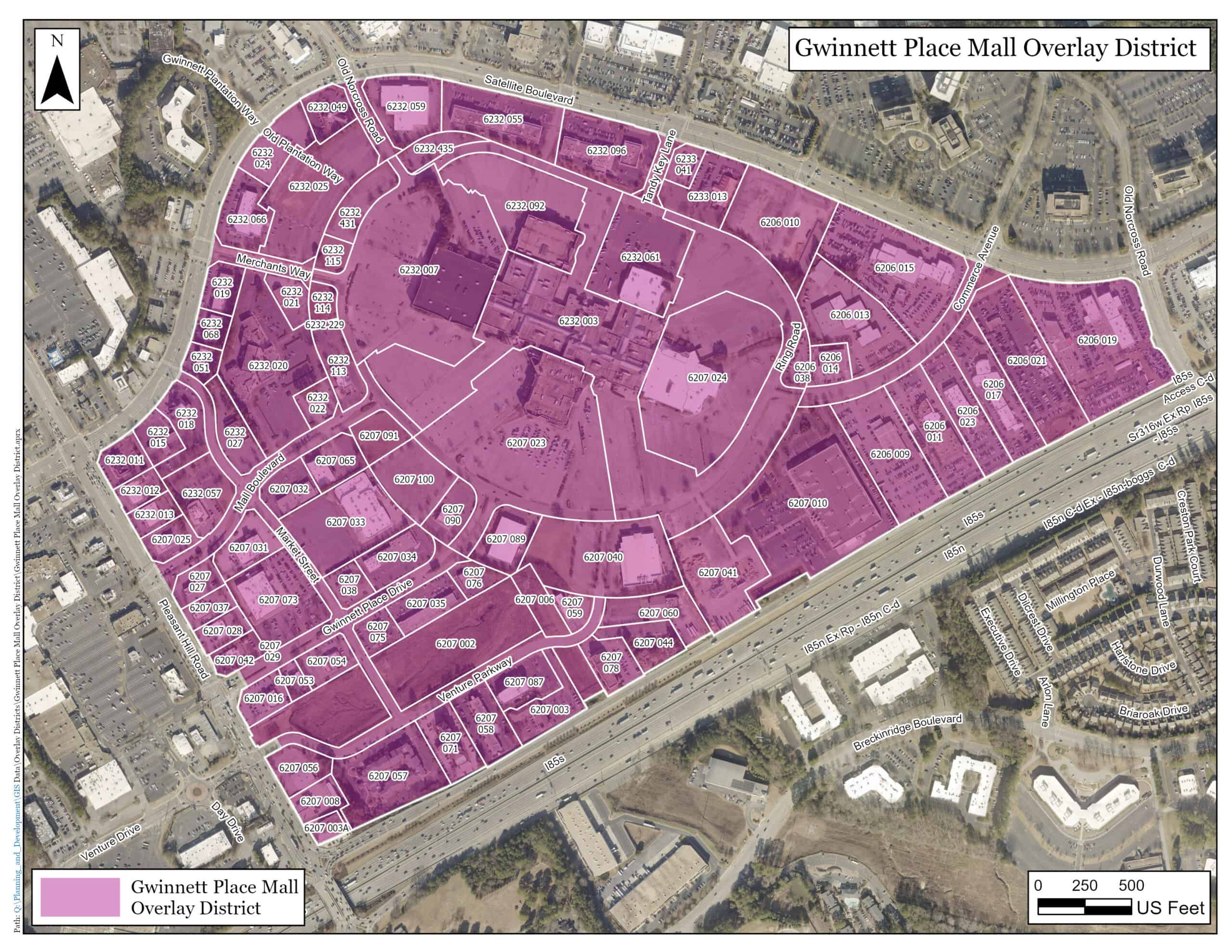 In October 2024, the Gwinnett County Board of Commissioners created the Gwinnett Place Overlay District. The purpose of the overlay district is to enhance the vitality and livability of the former Gwinnett Place Mall site by encouraging redevelopment of the area, as envisioned in the Gwinnett Place Mall Equitable Redevelopment Plan, the Gwinnett Place Mall Site Revitalization Strategy, and Gwinnett County’s 2045 Unified Plan. The Gwinnett Place Overlay will outline permitted uses and also control for the look, feel, and form based on the incorporation of six design elements: 1) Density, Height and Bulk; 2) Streets and Streetscape; 3) Parking and Loading; 4) Landscaping and Screening; 5) Open Space; and 6) Building Design. The Gwinnett Place Overlay will also establish a special administrative permit process to streamline the permitting process.