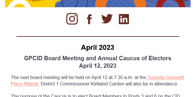 This edition includes a reminder for the Annual Caucus of Electors, Bisnow coverage of the Global Villages Implementation Plan, a recap of the Gwinnett Chamber VALOR Public Safety Awards, EV charging station information, initiatives to support Black-Owned district business and more.
