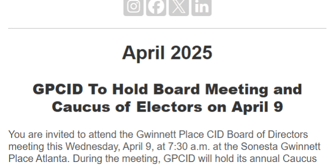 GPCID’s April newsletter includes information for the Caucus of Electors Meeting, the Gwinnett Place CID planning session recap and new LED lights being added in the district. Read more here.