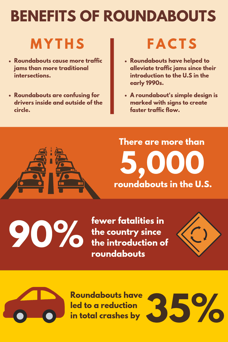 Roundabouts are a type of circular intersection that virtually eliminate right-angle and head-on collisions. Many people believe roundabouts are frustrating and inefficient, but they have proven to increase safety while reducing traffic. In fact, according to the U.S. Department of Transportation Federal Highway Administration, one-fourth of all traffic fatalities in the United States are associated with intersections. Roundabouts help to improve safety, decrease congestion, reduce pollution due to fewer stops and harder accelerations, and even save money. The introduction of roundabouts around the country has led to more than a 90 percent reduction in fatalities and a 35 percent reduction in all crashes (U.S. Department of Transportation Federal Highway Administration). Roundabouts are also safer for bikers and pedestrians when crossing traffic due to reduced motorist speeds.