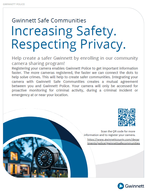 The Gwinnett County Police Department has initiated the Gwinnett Safe Communities program to improve safety and security across Gwinnett County, allowing property and business owners to integrate the video feeds from their security cameras directly to the police department. This connection is made possible through a FususCORE device, a video gateway. For more information, please visit GwinnettSafeCommunities.org.